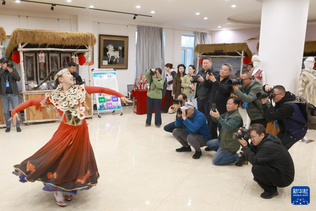 ??10月11日,赫哲族篝火舞傳承人尤迪向來訪者展示民族舞蹈《芒莫尼 烏蘇里》。
